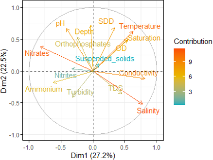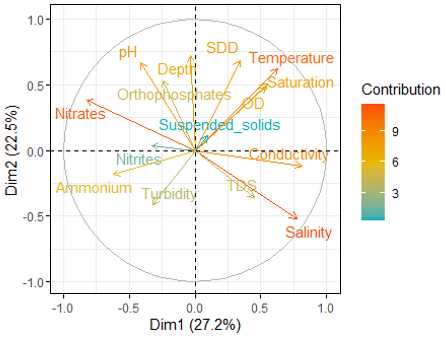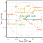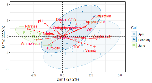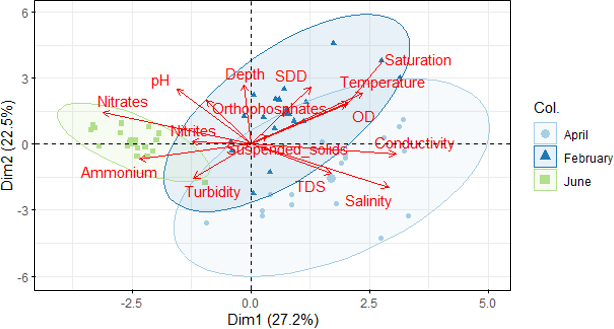 Figure 3Projections of water physicochemical parameters on the first 2 axes across sampling months.
