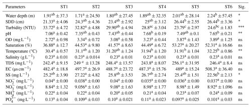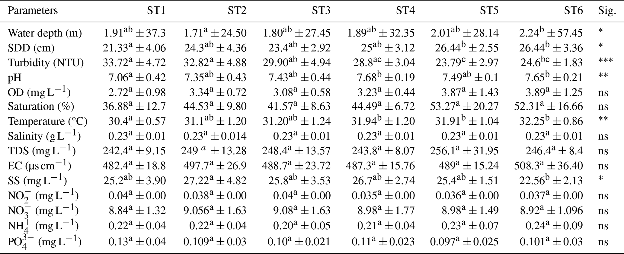 The mean values of the water physicochemical parameters and the results of statistical tests are presented in Table 1. SDD ranged between 21.33 ± 4.06 cm in ST1 and 26.44 ± 3.36 cm in ST6. The mean values of pH varied from 7.06 ± 0.42 in ST1 to 7.68 ± 0.19 in ST4. The water depth was included between 1.71 ± 0.24 m (ST2) and 2.24 ± 0.57 m (ST6). The mean values for turbidity varied from 23.79 ± 2.97 NTU in ST5 to 33.72 ± 4.72 NTU in ST1. Water temperature ranged between 30.4 ± 0.57 °C in ST1 to 32.25 ± 0.86 °C in ST6. Suspended solids was included between 22.56 ± 2.13 mg L−1 in ST6 and 27.22 ± 4.82 mg L−1 in ST2. Dissolved oxygen and oxygen saturation varied from 2.72 ± 0.98 mg L−1 and 36.88 ± 12.7 % in ST1 to 3.89 ± 1.25 mg L−1 and 52.31 ± 16.66 % respectively. EC ranged between 482 ± 18.8 µS cm−1 in ST1 to 508.3 ± 36.4 µS cm−1 in ST6. Also, Total Solids Dissolved (TDS) was included between 242.4 ± 9.15 mg L−1 in ST1 and 256.9 ± 31.95 mg L−1 in ST6. The parameters such as nitrate (8.84 ± 1.32 to 9.06 ± 1.63 mg L−1), nitrite (0.03 ± 0 to 0.04 ± 0 mg L−1), ammonium (0.20 ± 0.05 to 0.24 ± 0.09 mg L−1) and orthophosphate (0.10 ± 0.03 to 0.13 ± 0.04) were varied between stations 1 and 6.